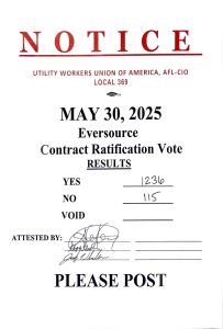 Thank you to all who came out today to vote on the ratification of the new contract between UWUA Local 369 and Eversource Energy. The contract passed with 1,236 in favor and 115 opposed. Please see the official results below. We look forward to our continued work with Eversource Energy and are pleased that we came to an agreement that supports our members.